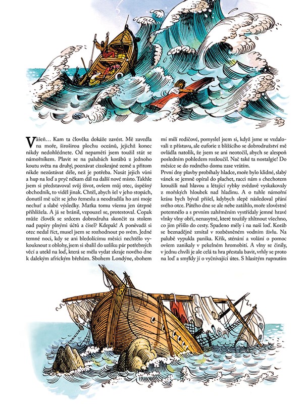 Mladý Robinson Crusoe toužil po tom stát se námořníkem. A taky se jím stal. Rodičům navzdory! Vydal se na plavbu a ztroskotal. Dlouhá léta pak trávil sám a sám na opuštěném ostrově. Myslíte si, že to byla nuda? Kdepak, zažíval tam spoustu dobrodružství, ale i horkých chvilek, kdy mu šlo zase o život. Jak to celé dopadlo? Hádejte! Nebo raději čtěte! Zkrácená verze legendárního díla Daniela Defoa v unikátním ztvárnění světoznámého výtvarníka Vojtěcha Kubašty vás k tomu doslova vybízí. Co myslíte, litoval Robinson, že neposlechl své rodiče, utekl na loď a zpečetil tak svůj osud trosečníka…?