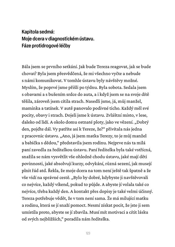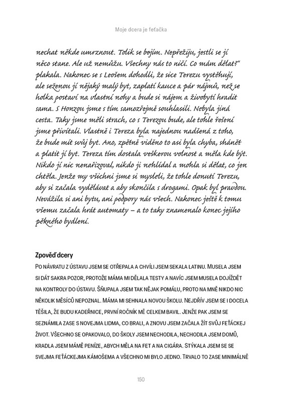 „Jsem matka. Ale od jisté doby si pokládám otázku, zda jsem byla vždy dobrá matka. Jestli jsem právě já nezavinila situaci, kdy se z mojí holčičky stala feťačka. (Ano, použiji tak ostré slovo, protože to, čím jsme si všichni prošli, nechci ‚změkčovat‘ neutrálními pojmy.) Nebo je to jen vina její a jejího okolí? Jako každý rodič feťáka si <