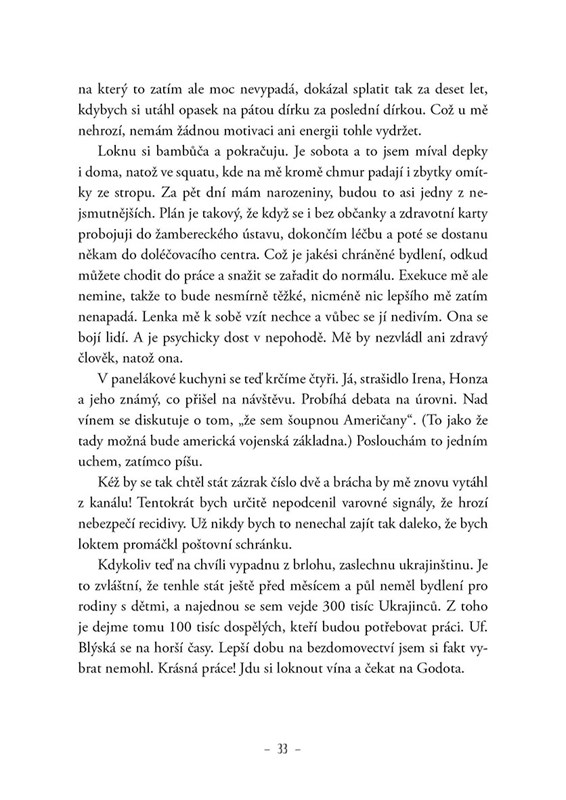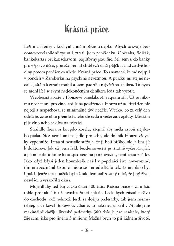 Někdy si s vámi život zahraje velmi nepěknou hru. A když se k tomu přidá alkohol a hazard, je zaděláno na pořádný průšvih. Michal Pohanka ví, o čem píše. Ztratil rodinu, práci i důstojnost. Žije, spíše řečeno přežívá na ulici, ve squatech a léčebnách. Stále bojuje se svými démony. Toto je jeho příběh – syrový a bez příkras. Přesto všechno si i v těch nejtěžších chvílích udržuje určitý nadhled a rozhodně mu nechybí smysl pro humor.