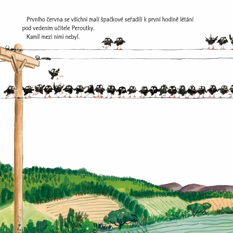 A potom přišel ten den. Špačkové se seřadili a vyletěli vysoko. A co Kamil, neuměl lítat. Odletěl s nimi?