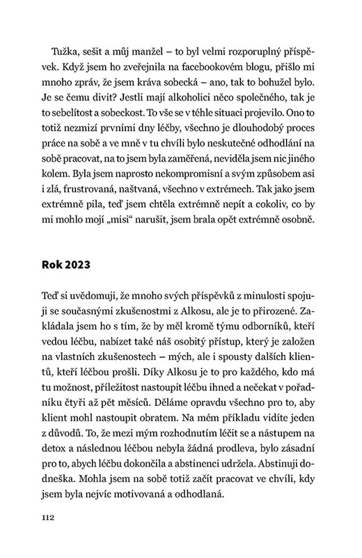 Blog Michaely Duffkové Zápisník alkoholičky vzbudil v roce 2019 velký ohlas – a dokonce získal ocenění Magnesia Litera za nejlepší blog roku. Jak vypadalo následujících pět let života mladé alkoholičky odhodlané se závislostí bojovat? Byly to roky střízlivé, vypjaté i šťastné. Michaele se narodily tři děti, vyrovnávala se s úzkostmi, řešila vztahové problémy a vybudovala centrum pro léčbu závislostí Alkos. Ponořte se do niterné a terapeutické zpovědi ženy, která si vás získá svou naprostou otevřeností. Třetí kniha Michaely Duffkové vychází zároveň s premiérou filmu natočeného podle její prvotiny. Svým pohledem na závislosti a filmovou reflexí do ní přispěl také režisér Dan Svátek.