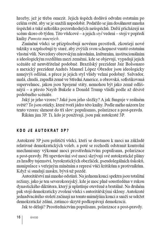 Donald Trump, Vladimir Putin, Viktor Orbán, Recep Tayyip Erdogan, Benjamin Netanjahu, filipínský Rodrigo Duterte, venezuelský Nicolás Maduro, ale i komunistická Čína či Módího Indie. Záběr nové knihy knize Pomsta mocných Moisése Naima je skutečně globální. Věnuje se zde trendům, podmínkám a technologiím, které přispívají ke koncentraci moci. Zaměřuje se přitom zejména na „3P“ - populismus, polarizaci a postpravdy. Ty jsou tu sice odjakživa, ale dnešní autokraté je kombinují a novými, leckdy děsivými způsoby tak podkopávají demokracii.