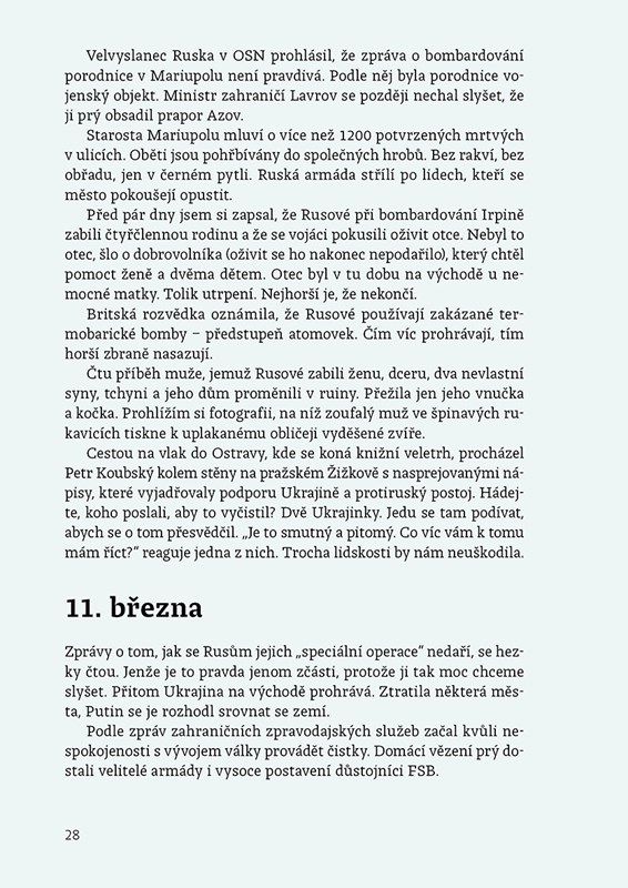 Ruský vpád na Ukrajinu zasáhl reportéra Deníku N Lukáše Prchala natolik, že si začal psát deník. O tom, co se dělo na frontě, v redakci, ale i v jeho nitru. Geopolitické šachy se v jeho svižných zápiscích mísí se střípky z osobního života. Válečná zvěrstva kontrastují s příběhy hrdinství.