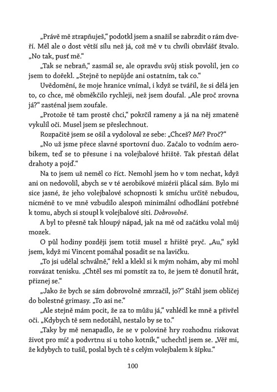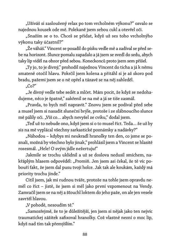 Vincent je chytrý, vtipný, sebevědomý a přitažlivý, což drtivá většina jeho okolí oceňuje. Denise ale vytáčí už od první chvíle, kdy mu z talíře ukradne hranolek. Vincentova nespoutanost a přímočarost ho rozčiluje a fascinuje zároveň. Být v blízkosti bohéma, který hltá život, rozdává úsměvy a zároveň vyslovuje těžké životní pravdy, pro něj znamená vystoupení z komfortní zóny. Boj s vlastními pocity užírá Denise zevnitř, poprvé ale vnímá, že je opravdu naživu. Vidí všechny barvy, slyší každý nádech a cítí. Doopravdy cítí.