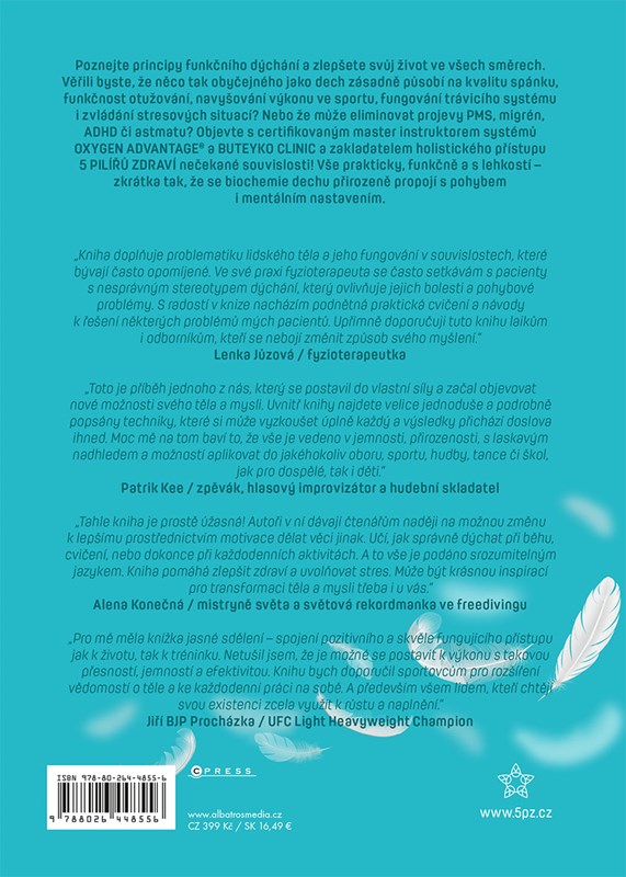 Začtěte se do jeho bestselleru a objevte nečekané souvislosti. S certifikovaným master instruktorem systémů OXYGEN ADVANTAGE® a BUTEYKO CLINIC a zakladatelem holistického přístupu 5 PILÍŘŮ ZDRAVÍ poznáte, jak se dech pojí s fungováním nervové soustavy, fyzickým výkonem, mentální odolností i celkovou regenerací. Tato kniha není o dechových rituálech, ale o návratu k fyziologii. Nabízí praktické principy funkčního dýchání, které může využít každý: od dětí po důchodce, od sportovců po učitele, od zdravotníků po rodiče.