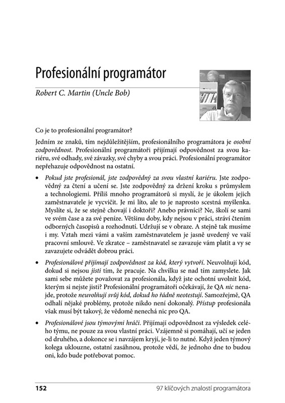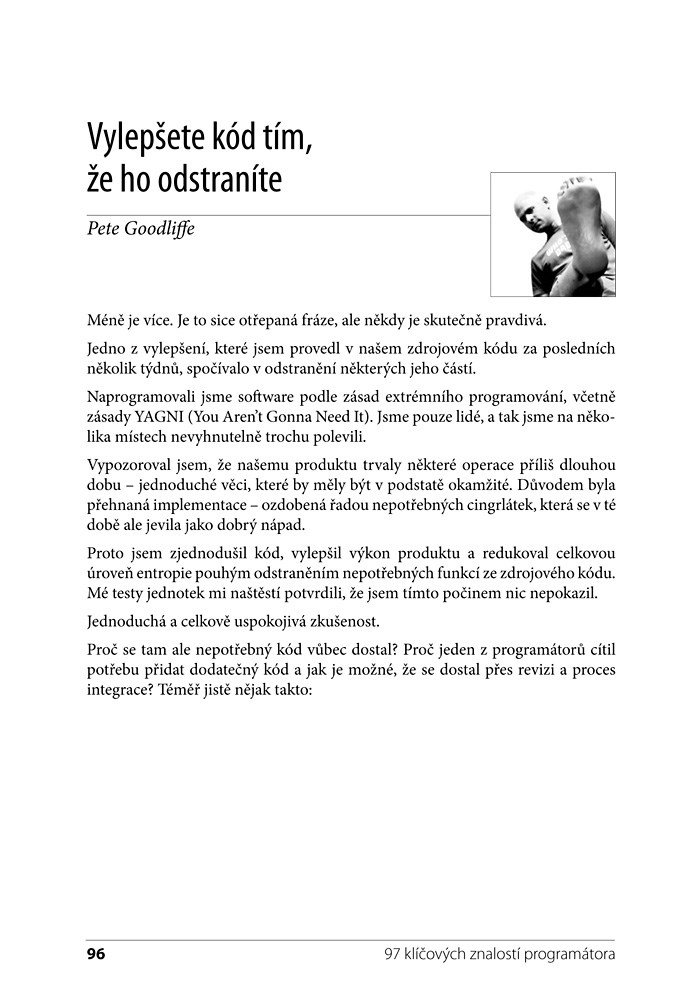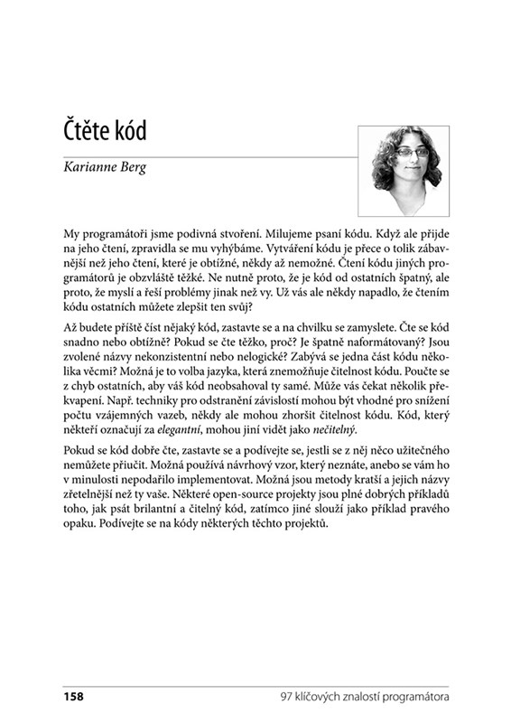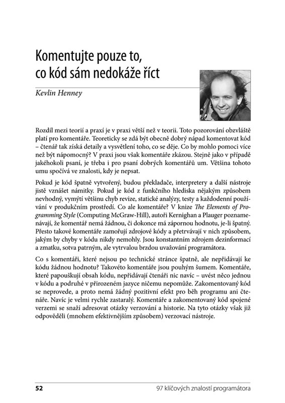Kniha je netradiční hned ve dvou směrech. Nespoléhá se na jediného autora, na výsledném textu se podílelo přes 70 přispěvatelů, díky kterým publikace pokrývá široké spektrum témat. V knize nenajdete klasické kapitoly plné teorie, místo nich byla zvolena forma krátkých výstižných tipů, o které se s vámi podělí přední světoví specialisté. Nečekejte popisy algoritmů, vysvětlení funkcí či návod na instalaci překladače, na knize se podíleli experti, pro které je programování denním chlebem. Rady, jež v knize najdete, je mnohdy stály mnoho sil, energie a prostředků – vy už podobné chyby opakovat nemusíte.