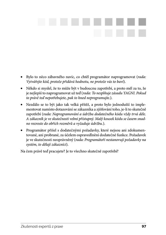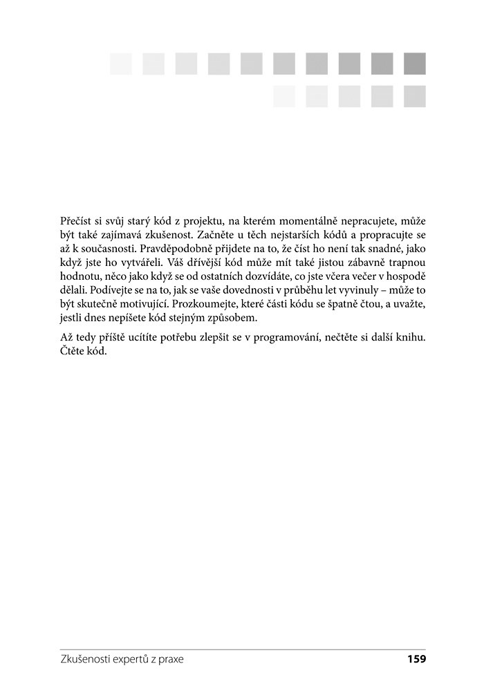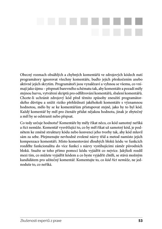 Kniha je určena všem, jejichž práce se točí kolem programování. Nejen programátoři, ale i projektoví manažeři, softwaroví architekti a analytici v ní najdou užitečné rady z praxe. V úvodu knihy jsou jednotlivé tipy rozděleny do oblastí podle zaměření. V knize najdete rady: