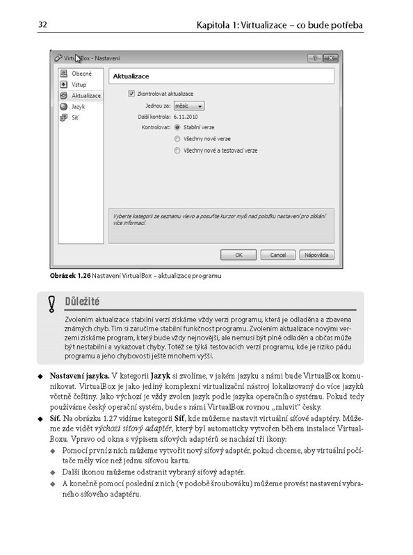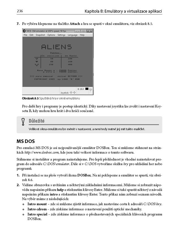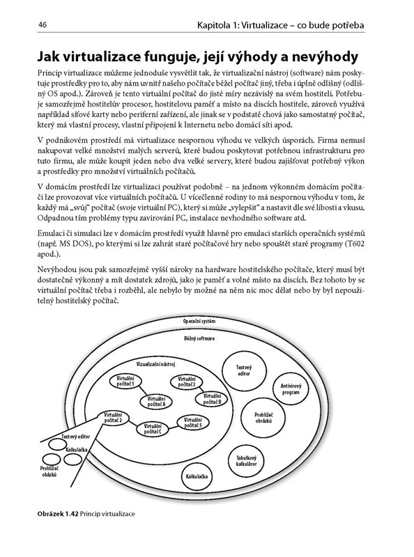 Tato přelomová publikace vám ukáže, že slova virtualizace se není třeba obávat a že se virtualizace může stát běžnou součástí vaší práce s počítačem. Naučíte se pracovat s virtualizačními nástroji: Microsoft Virtual PC, VirtualBox, VMware Player i VMware Workstation, vytvořit virtuální počítač a nainstalovat do něj Windows nebo Linux. Kromě domácích uživatelů mohou knihu využít také podnikatelé, kteří byli při nákupu nových počítačů nuceni přejít na nový operační systém. Je rovněž určena nadšencům, kteří před časem používali osmibitové počítače (Atari, Commodore) a rádi by si pomocí emulátorů opět zahráli některé starší hry či spustili starší aplikace.