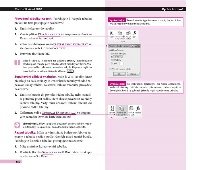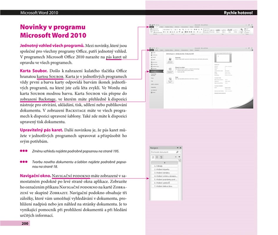 Nemusíte studovat obsáhlé příručky, chceteli ve Wordu provádět činnosti, které ke své práci či při domácím využití obvykle potřebujete. Dnešní počítače se ovládají vizuálně a interaktivně, proto i naše knihy jsou vizuální a interaktivní. Nepochybujeme, že umíte číst, ale obrázek vydá za tisíc slov a lépe se pamatuje Tento moderní průvodce na rozdíl od jiných knih program Microsoft Word 2010 nepopisuje, ale všechny běžné činnosti vám ukáže: