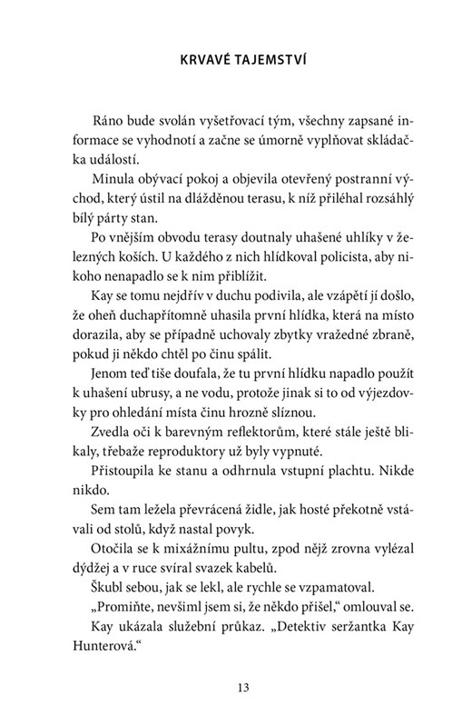 Večírek na zahradě kentského zámečku se nečekaně zvrtne, když je objevena mrtvola šestnáctileté Sophie, na jejíž počest se slavnost konala. Kay Hunterová a její kolegové jsou brutální vraždou šokováni. Na začátku vyšetřování se zdá, že vrah bude brzy čelit spravedlnosti, ale nakonec se ukáže, že podezřelých je mnohem víc. Jak je možné, že tolik lidí mohlo mít motiv k vraždě mladé nevinné dívky? Aby Kay zjistila, kdo za vraždou stojí, musí odhalit temná tajemství exkluzivní komunity, do níž Sophie patřila. A to nebude snadné. Kay navíc stále pátrá po vlastních nepřátelích, a když učiní šokující objev, má pocit, že její život už nikdy nebude stejný.