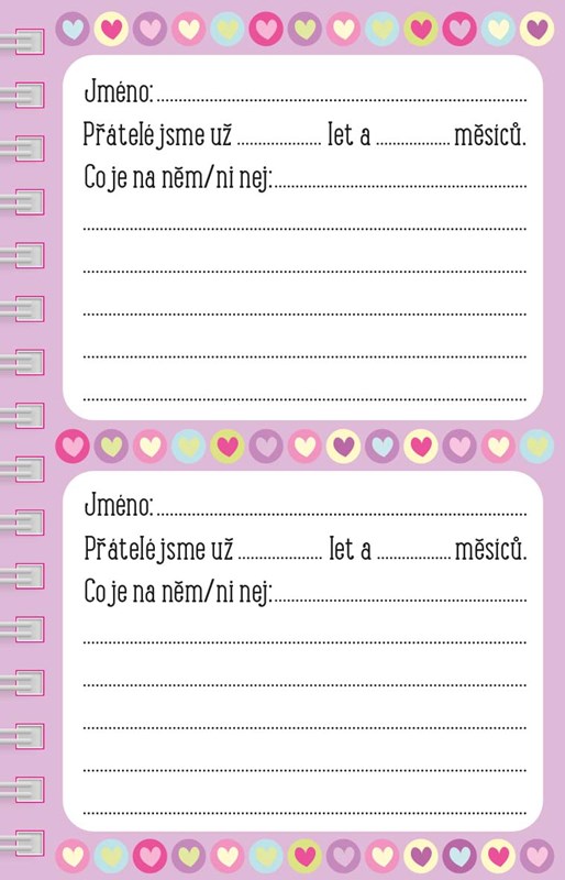 Tento zápisník je k tomu jako stvořený. Jaké jsou tvé nejmilejší koníčky, aktivity, záliby nebo tajná přání? Co tě baví a v čem jsi dobrá? Vezmi tužku do ruky, odpovídej na otázky a odhal své srdce. Zábava začíná!