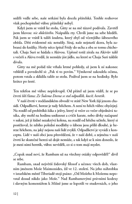 Shulem Deen vyrůstal na okraji New Yorku v uzavřené komunitě skvyrských chasidů, jejichž svět je okolnímu světu nepřístupný a má blíž východoevropským ghettům minulých staletí než současné Americe. Kdo odejde, už se nevrací je neobyčejně silný příběh o víře a pochybnostech, o lidském údělu rozervaném potřebou smířit věrnost pravdě prožívané zkušenosti s neúprosnou silou hluboce zakořeněné tradice. Shulem Deen píše své strhující paměti až s drásavou poctivostí. Chce dostát nárokům chasidského způsobu života, ale nedokáže nic předstírat, a za tuto neschopnost musí zaplatit krutou daň. Toto autentické svědectví o chasidské současnosti svou naléhavostí přesahuje svět chasidů a otevírá otázky univerzálně lidské. V roce 2015 bylo oceněno jako nejlepší židovská kniha roku a stalo se světovým bestsellerem.