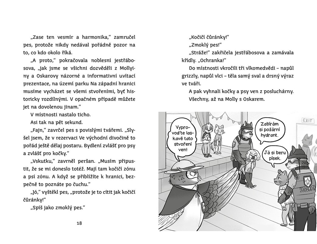 Kočku Molly, zkušenou stopařku protřelou divočinou, a psa Oskara čeká kempování s rodinami – rodiči, sourozenci, bratranci, sestřenicemi, strýčky i tetami – v rezervaci ve Východní divočině. Ale pozor, kočky nechť odpočívají v kočičí zóně, psi musí čenichat zase ve své. Překračování okrsků je ZAKÁZÁNO a pro tyhle zvířecí rivaly to platí dvojnásob!
