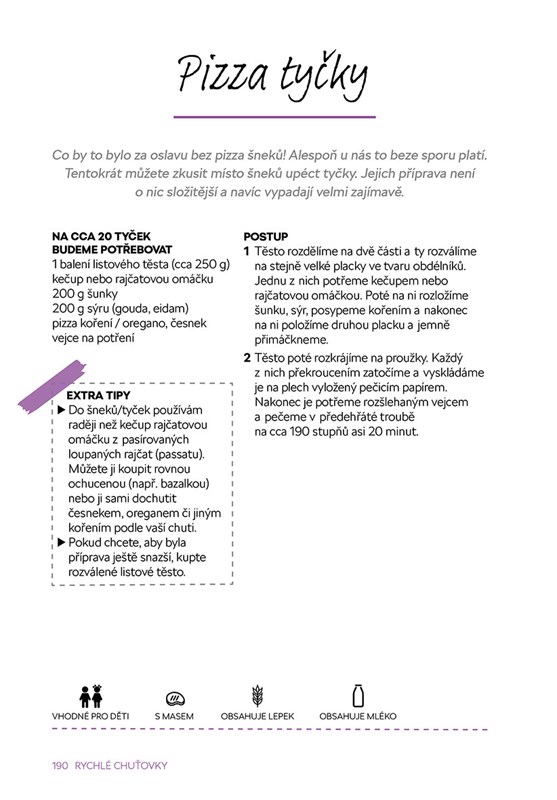 V kuchařce najdete 90 receptů přehledně rozdělených do kategorií polévky, hlavní jídla, dezerty a rychlé chuťovky, s nimiž vás žádná nečekaná návštěva už nikdy nezaskočí. Baví mě dávat klasickým receptům šmrc, a tak v kuchařce najdete třeba recept na koprovou omáčku s cuketou nebo sekanou s červenou čočkou. Každý recept je opatřen ikonkami pro snadnější přehled, zda je vhodný pro malé strávníky, vegetariány nebo osoby intolerantní na lepek či laktózu.