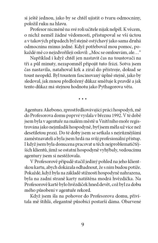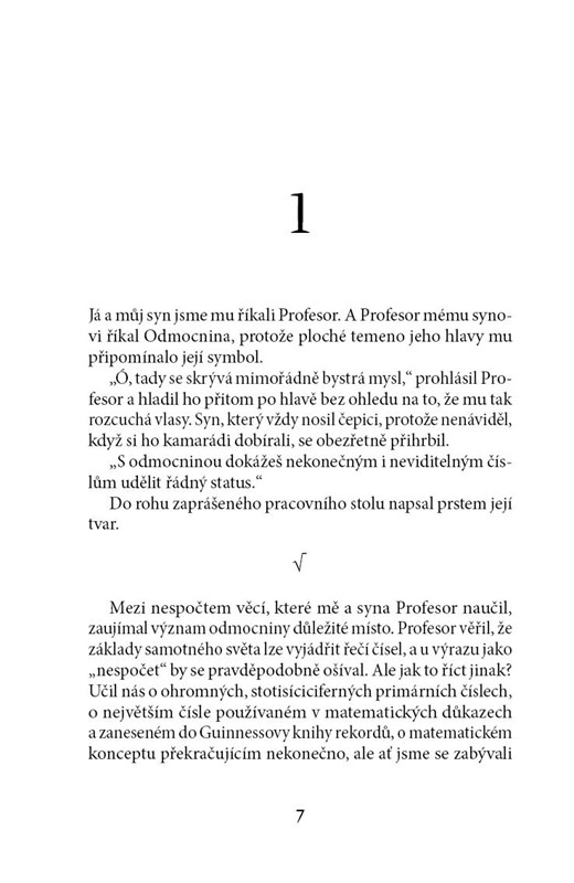 On je „Profesor“, vynikající znalec matematiky s neobvyklou poruchou: od úrazu hlavy, který utrpěl při dávné autonehodě, umí v paměti uchovat pouze vzpomínky mladší osmdesáti minut, vše ostatní zapomíná. Ona je zručná hospodyně, svobodná matka desetiletého syna, kterou najali, aby o něj pečovala. Každé ráno se tak Profesor s hospodyní nanovo seznamují a rozvíjí se mezi nimi podivuhodné a krásné přátelství. A ačkoli Profesorův mozek funguje jako páska, která se vždy po osmdesáti minutách začne přemazávat, jeho mysl je stále svěží, hýřící elegantními rovnicemi z minulosti. Čísla pak ve svém přesném uspořádání odhalují hospodyni i jejímu synovi nový, bezpečný a poetický svět. Profesorova milovaná rovnice je okouzlující příběh o tom, co to znamená žít v přítomnosti, a o podivuhodných rovnicích, které dokáží utvářet rodinu.