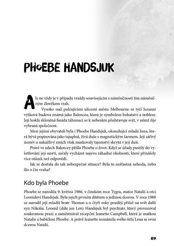 Chladné světlo měsíce dopadá na tvář spícího člověka. Ten se najednou zvedá a s vytřeštěnýma očima opouští místnost – stále však spí. Náměsíčnost je reálný fenomén, který inspiroval nespočet popkulturních děl. Věděli jste však, že v tomto stavu lidé mohou spáchat vraždu a nevědomky připravit o život partnera nebo vlastní dítě? Poznejte skutečné případy vražd s tajemnou aurou somnambulismu! Které byly vskutku sporné a kdy si pachatel jen pokoušel snížit trest? To a mnohem více zjistíte ve strhujícím true crime vyprávění.