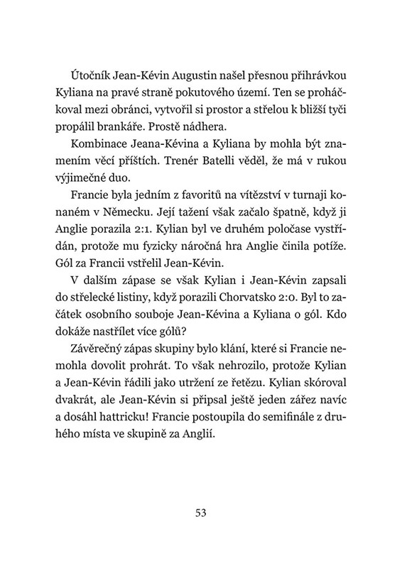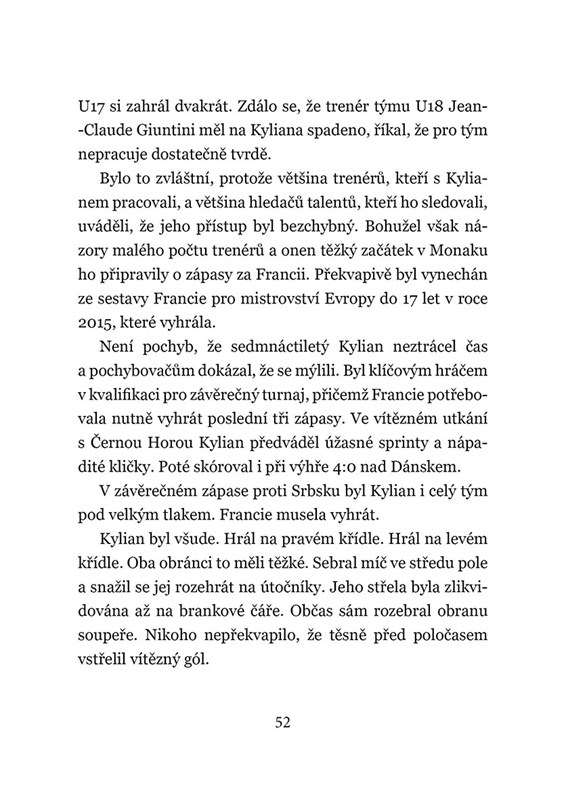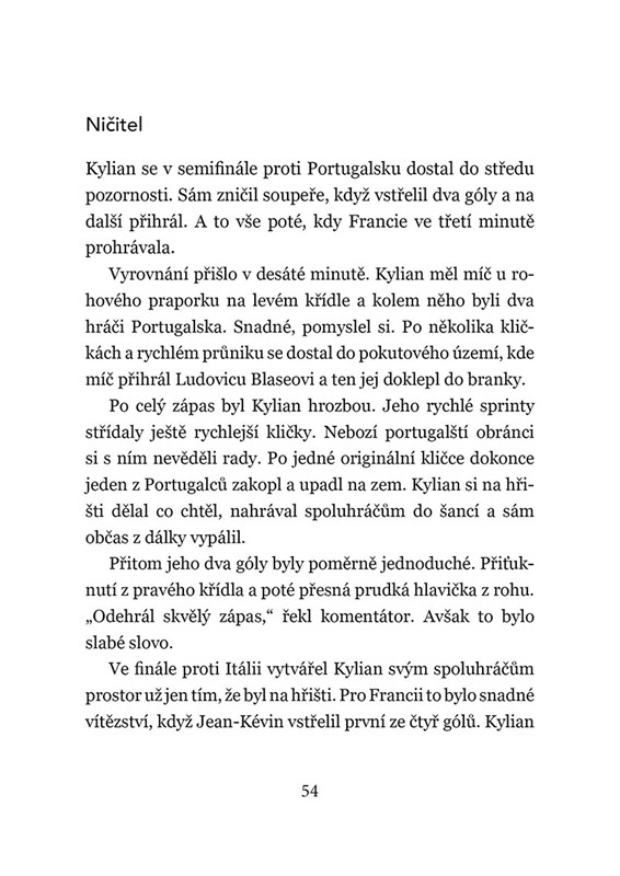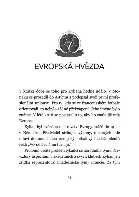 Kylian Mbappé je opravdová superhvězda, a přitom pořád skromný kluk z malého pařížského předměstí. Jeho životní i fotbalový příběh je inspirací pro spoustu dětí i mladých sportovců na celém světě. Díky této knize se dozvíte, jaké měl Kylian dětství, kdy začal hrát fotbal a seznámíte se s jeho rodinou. Hlavním tématem je však samozřejmě fotbal a Kylianova cesta z malého fotbalového oddílu AS Bondy až do klubového gigantu jménem PSG, francouzského národního týmu a dosažení mety nejvyšší, zisku titulu na světovém šampionátu.