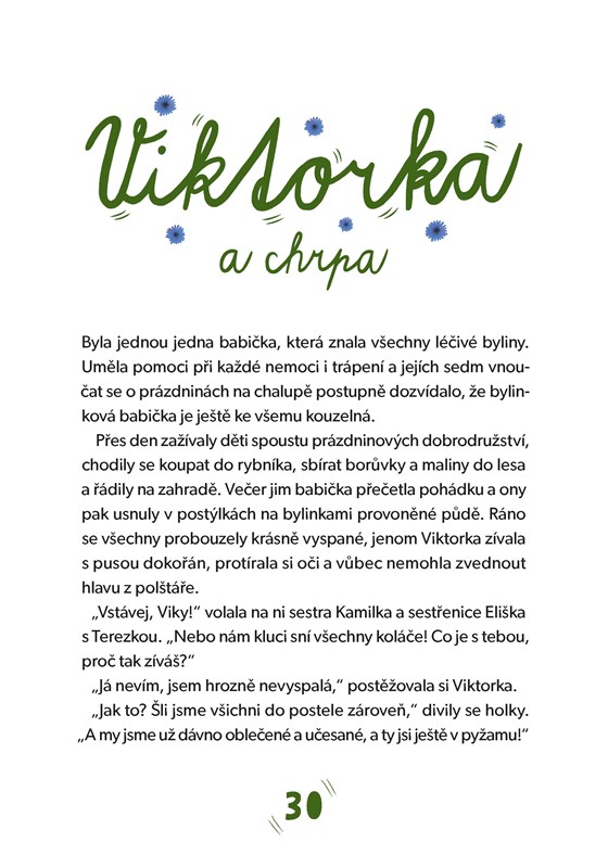 Byla jednou jedna babička a ta měla sedm vnoučat: čtyři holčičky a tři kluky. Kromě nich však měla také velké tajemství. Nikdo totiž netušil, že je kouzelná! V přírodě vždy dokázala najít neviditelné, tajuplné a čarovné věci, o kterých jiní lidé nemají ani tušení. O téhle babiččině schopnosti nevěděla ani její vnoučata, ale to se jednoho dne změnilo. Jakou moc ukrývá třezalka, hluchavka, chrpa, dobromysl nebo heřmánek? To všechno se dozvíte během pohádkových letních prázdnin u bylinkové babičky!