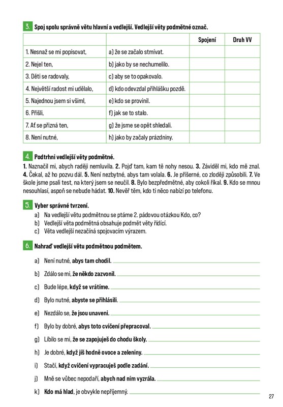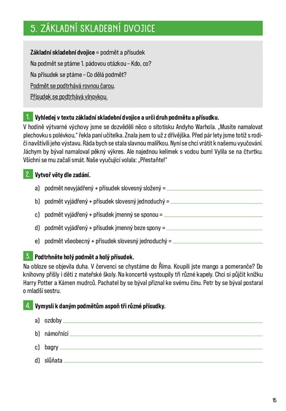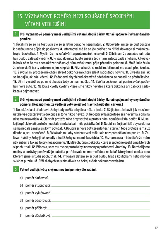 Potřebujete proniknout do tajů větné skladby a odhalit záhadu hlavních a vedlejších vět? Hledáte klíč k určování souvětí souřadného či podřadného? Správné rozeznání významových poměrů a větných členů vám nedá spát? Tak sáhněte po naší cvičebnici. Vysvětlíme vám teorii a přidáme hromadu cvičení, díky nimž látku skvěle pochopíte. Vyzkoušíte si například rozbor složitějších souvětí, a věta jednočlenná, dvojčlenná, větný ekvivalent nebo přímá a nepřímá řeč vás už nikdy nezaskočí.