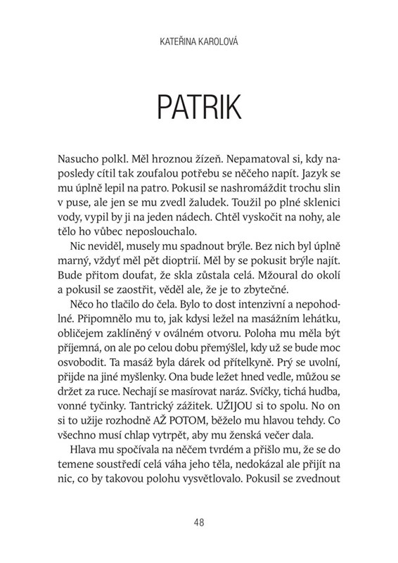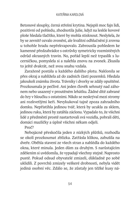 Jsou tři, i když každý sám. Probudí se na neznámém místě, netuší kde, neví proč. Nic si nepamatují. Julie procitá na zemi v cizí koupelně, s nevolností a pořádnou bolestí hlavy. Není schopná z paměti vydolovat jedinou smysluplnou vzpomínku, která by se týkala právě uplynulých chvil. Neví, u koho se nachází, ani jak se do prázdného domu dostala. Ale vše je jí zvláštním způsobem povědomé. O kus dál se probouzí Viktor. Obklopuje ho podivné ticho. Nemá ponětí, proč neleží ve své posteli, v bytě poblíž oblíbené restaurace. Nikdy se z města nevzdálil, dobrovolně by ho neopustil. Je vyděšený. Přeje si jediné, najít cestu pryč. Patrika vytrhne ze spánku bolest a stejně jako ostatní tápe s naprostou marností v zamlžených vzpomínkách. Nedokáže promluvit a nic nevidí. Ale jako jediný ví, že je někdo poblíž... Český mysteriózní román úspěšné spisovatelky Kateřiny Karolové právě vychází v novém vydání.