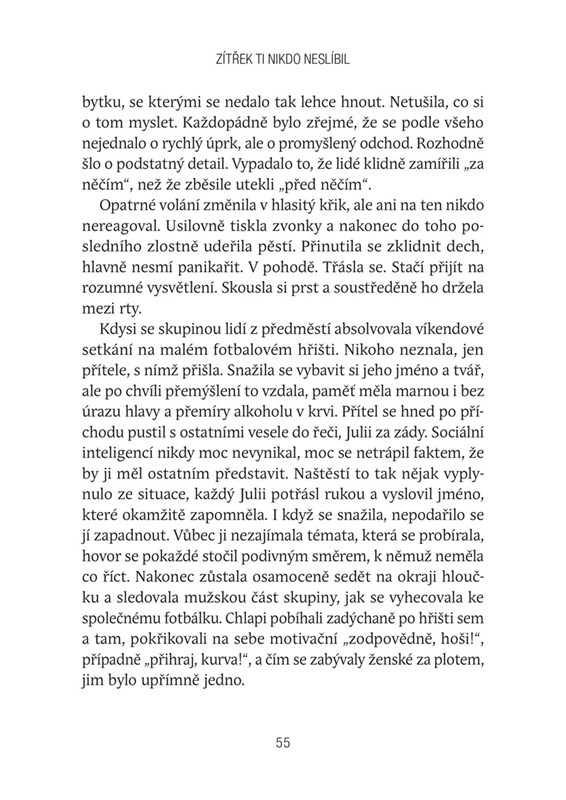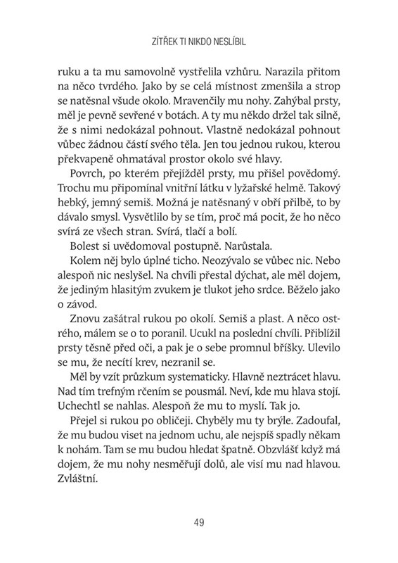 Zítřek ti nikdo neslíbil. Příběh, který si vás podmaní od prvního písmenka a nebudete chtít knihu odložit. Tři lidé, tři příběhy, tři osudy....probudí se vždy na podivném místě, nic si nepamatují, jsou zmatení a snaží si vzpomenout co se s nimi stalo... svět je stejný a přesto jiný... Od prvního okamžiku cítíte mrazení v zádech, ponurou atmosféru a všudypřítomný strach. Julie, Patrik a Viktor. Tři lidé s jejichž příběhy se přenesete do míst, která byste nenavštívili a věřte, že asi ani nechcete...a nebo? Budeme za tato místa rádi všichni? Nemohu vám moc prozradit, abych se nedopustila spoileru, protože to by mě mrzelo. Jediné co vám prozradím je, že vám v cca polovině knihy padne brada, prožijete šok a budete chtít číst dál a dozvědět se celou pravdu. Pro mě byla i druhá část knihy velice čtivá, protože to, jak autorka líčí určitou věc pro mě bylo krásně uchopeno a zajímalo mě, jak vše skončí.