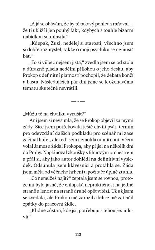 Prokop je hudební skladatel, Zuzana spisovatelka a scenáristka. On pořádá festivaly, ona kurzy tvůrčího psaní. Ve svém venkovském domě žijí jeden pro druhého. Na první pohled ideální pár. Dlouholetá harmonie má ale prasklinky, ze kterých se derou pochybnosti. Stárnoucí Prokop cítí, že své milované ženě už nedokáže nabídnout dřívější vášeň. Jeho plán je tedy jasný... a skandální. Zuzana potřebuje milence! Ustojí jejich vztah tak absurdní návrh? A co když nakonec není tak absurdní, jak se zdá? V bizarní a citově náročné životní situaci pozná Zuzana inspirativní přítelkyni a s ní i novou energii a osvobozující nadhled.