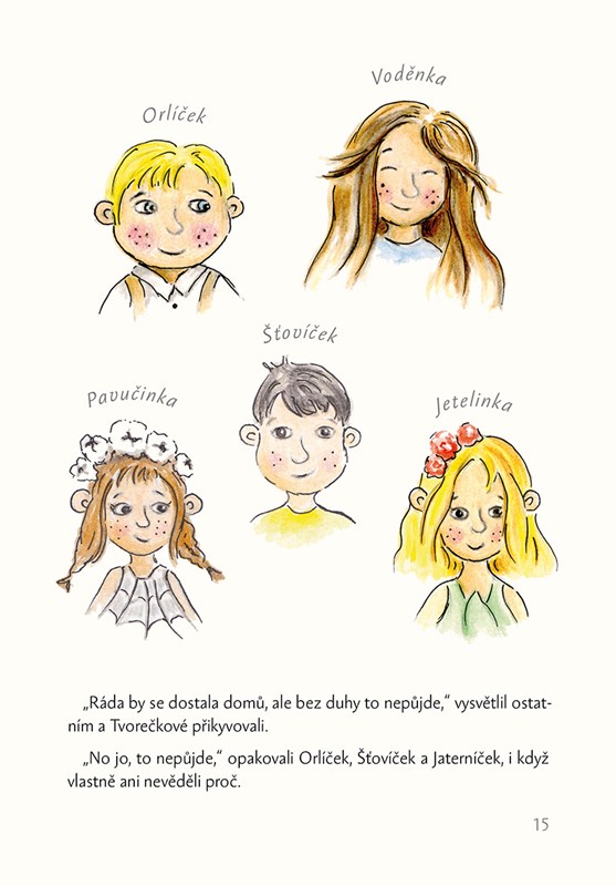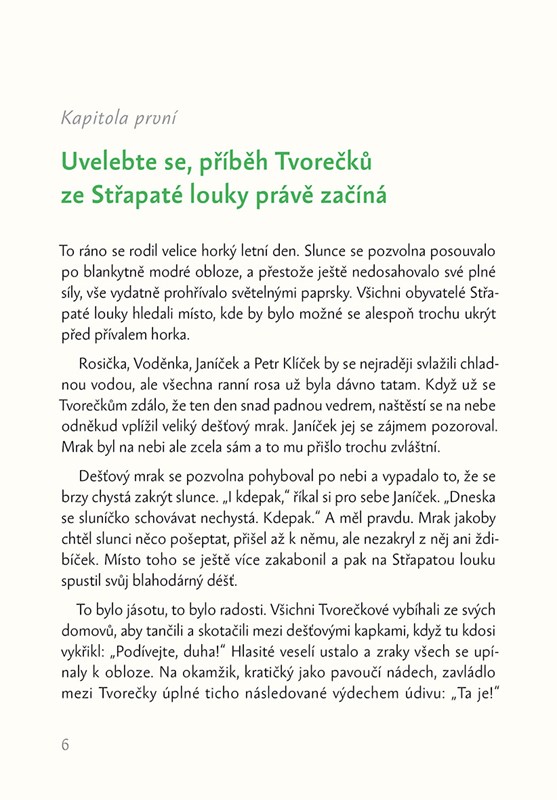 Příběh Slečny Duhy zavede dětské čtenáře mezi Tvorečky, jejichž vesnici najdeme na samém okraji Střapaté louky. Tvorečků zde žije jedenáct a každý z nich je něčím jedinečný. Jedno však mají přece jen společné – dobré a laskavé srdce, díky kterému se zatoulaná duhová dívenka může cítit v jejich společnosti jako doma. Postupně poznává své nové přátele, se kterými se vydává na dobrodružnou cestu do doposud neprozkoumaných Buclatých skal. Nechte se vtáhnout do milého příběhu zalitého letním sluncem, deštěm i stříbrným měsíčním svitem, kde přátelství a láska k přírodě jsou tím největším bohatstvím.