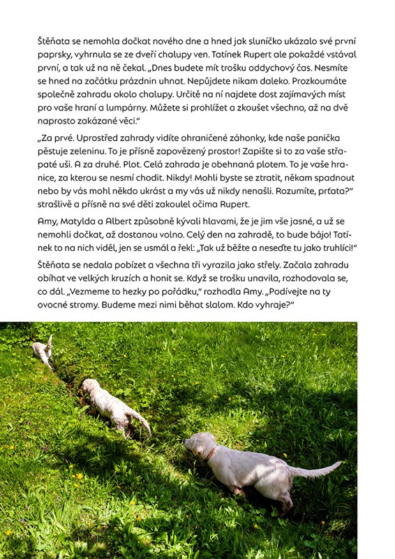 Seznamte se s našimi psími hrdiny, štěňaty zlatých retrívrů: Amy, Matyldou a Albertem. Štěněcí trojka tráví prázdniny v Krkonoších společně s maminkou Nelly a tatínkem Rupertem. Kromě toho, že skotačí a páchají pořádné skopičiny, poznávají také svět okolo sebe – louku, les, rybník či skály. Učí se plavat, poslouchat páníčky, zkrátka všechny potřebné psí dovednosti. Při svých toulkách navíc narazí na opravdové lesní skřítky. Ti jim vyprávějí mnoho zajímavého o přírodě, rostlinách a o zvířatech, která v ní žijí. Na štěňata ovšem čeká také pořádná porce dobrodružství, při kterých musí prokázat svoji odvahu. Začtěte se do jejich příběhů doprovázených krásnými fotografiemi a milými perokresbami.