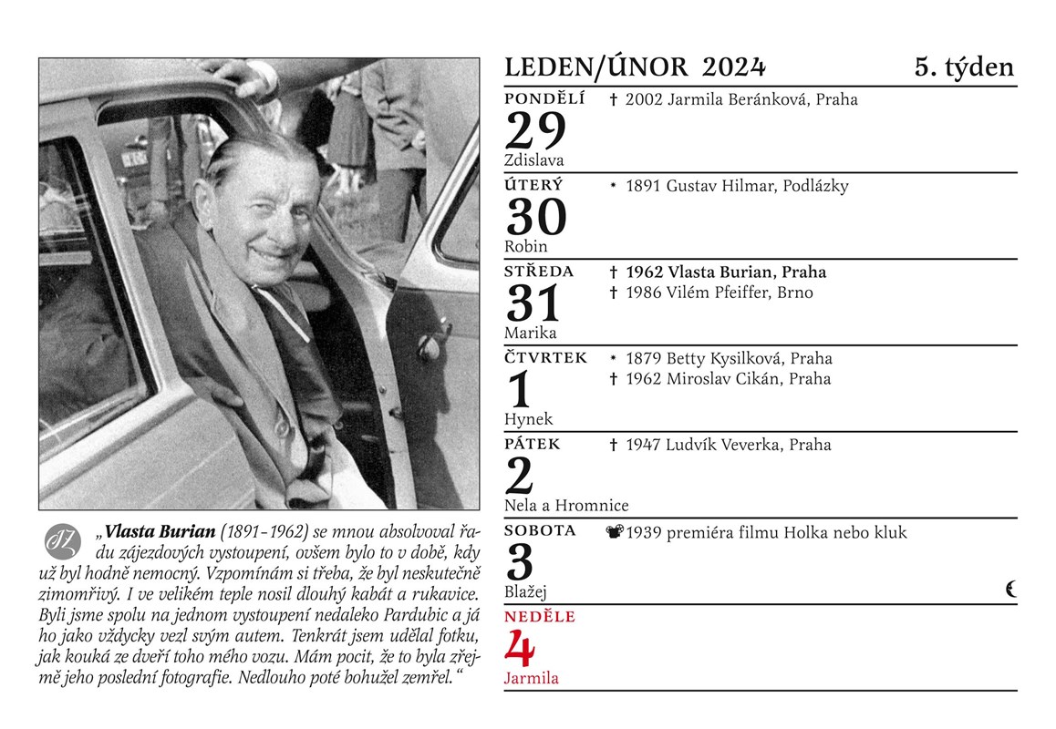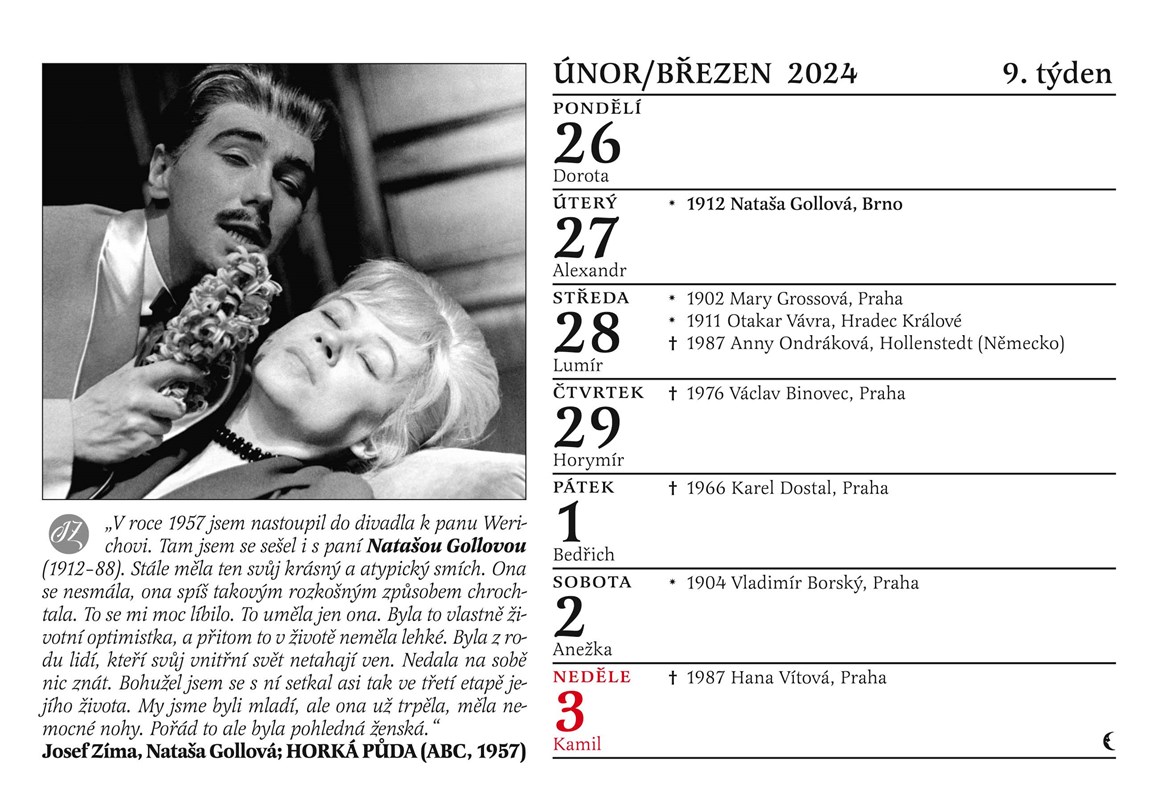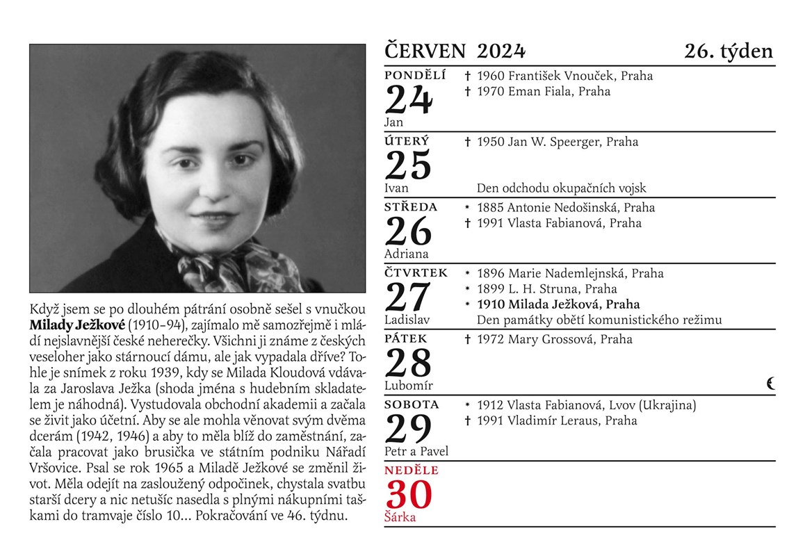 Zajímavým bonusem letošního kalendáře jsou výsledky autorova pátrání po životě nejslavnější české neherečky Milady Ježkové. Do srdcí diváků se zapsala hláškami jako: „Máňa říkala, že to není směroplatný!“, „Máte sklep? A mohla bych ho vidět?" (Kulový blesk, 1978), nebo „Doktor říkal, že je Otík momentálně zavostalej.“ (Vesničko má, středisková, 1985). Kde se ale vlastně tahle dáma vzala a jaký byl její osud? I to se dozvíte na stránkách kalendáře na rok 2024.