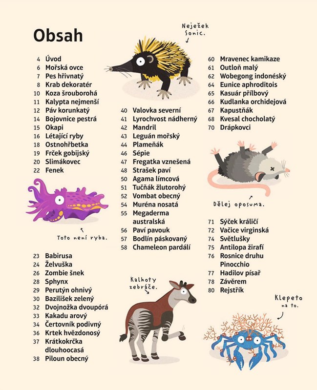 Věděli jste, že okapi nemají nic společného s okapy, ale zato si dovedou jazykem olíznout uši? Nebo že se v přírodě prohánějí zombie šneci? No a třeba papoušci kakadu umí vystřihnout parádní bubenické sólo, mořské ovce jsou ve skutečnost slimáci a jistý druh mravenců dokáže na povel explodovat. A jaké potrhlosti vyvádějí takoví kapustňáci, vombati, hovniválové, želvušky nebo lyrochvosti? To zjistíte v této báječné knížce plné podivuhodných zvířat, se kterými si užijete kopec legrace!