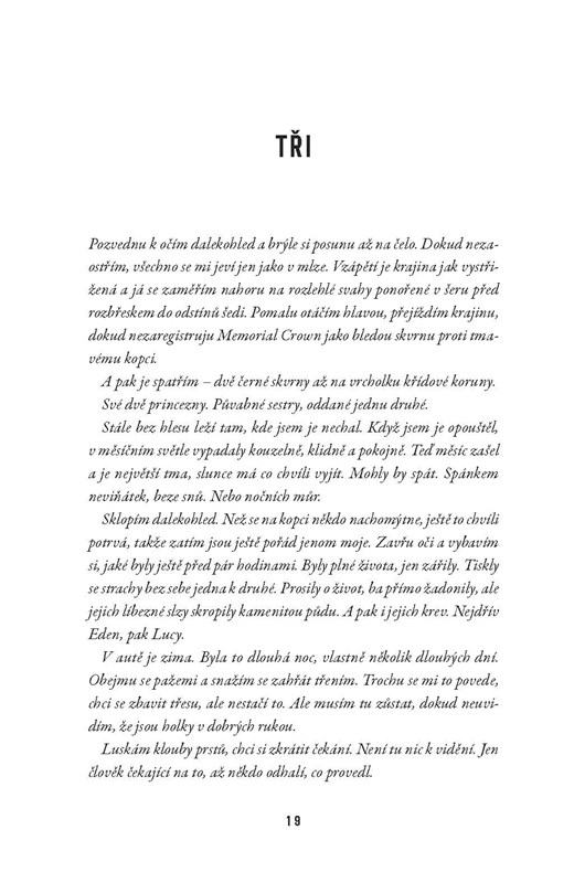 Kdesi v Canterbury leží na ztichlé stráni dvě dívky. Ve vlasech mají diadém, každá v ruce svírá rudou růži. Mohlo by se zdát, že spí… ale mají podříznutá hrdla. Policie záhy zjistí, že jde o dvě ze tří sester a ta poslední se pohřešuje. Pro inspektorku Lexi Bennettovou je mrazivý případ osobní. Před lety totiž ji i její dvě sestry stihl podobný osud. Vrátil se muž, který je v mládí unesl? Při pátrání po identitě vraždícího netvora se inspektorka každou minutou noří hlouběji do temnoty. A čas je proti ní.