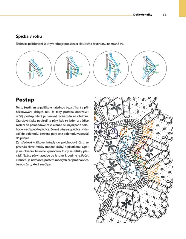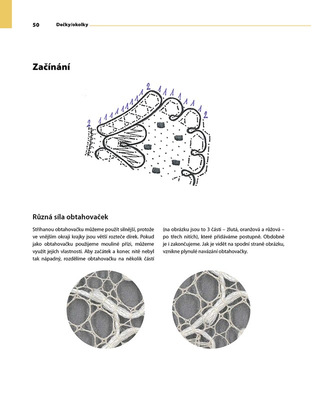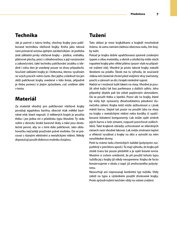 Na začátku knihy najdete jeden výchozí vzor pro metrovou krajku. Drobnými či většími zásahy do této krajky vznikla řada podvinků a návodů na šperky, dečky, obrázky a další variace.