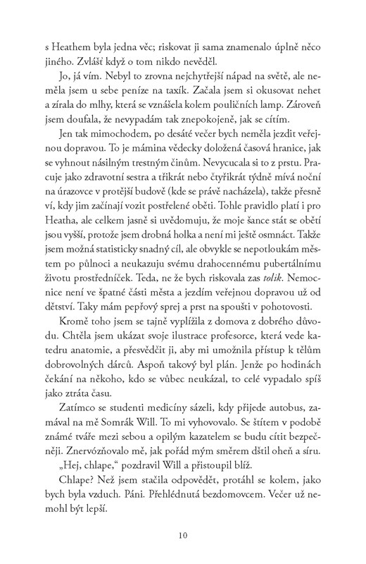 Beatrix Adamsová přesně ví, jak stráví léto před maturitním ročníkem. Je odhodlaná jít ve stopách da Vinciho a pustit se do něčeho, co jí poskytne výhodu ve výtvarné soutěži sponzorované muzeem: chce vytvářet dokonalé anatomické kresby. K tomu ale potřebuje vidět skutečné mrtvoly… naživo. Pokusí se proto dostat do nemocničního programu, aby mohla docházet na pitevnu, a cestou domů potká v nočním autobusu tajemného Jacka, který její plány obrátí úplně naruby.