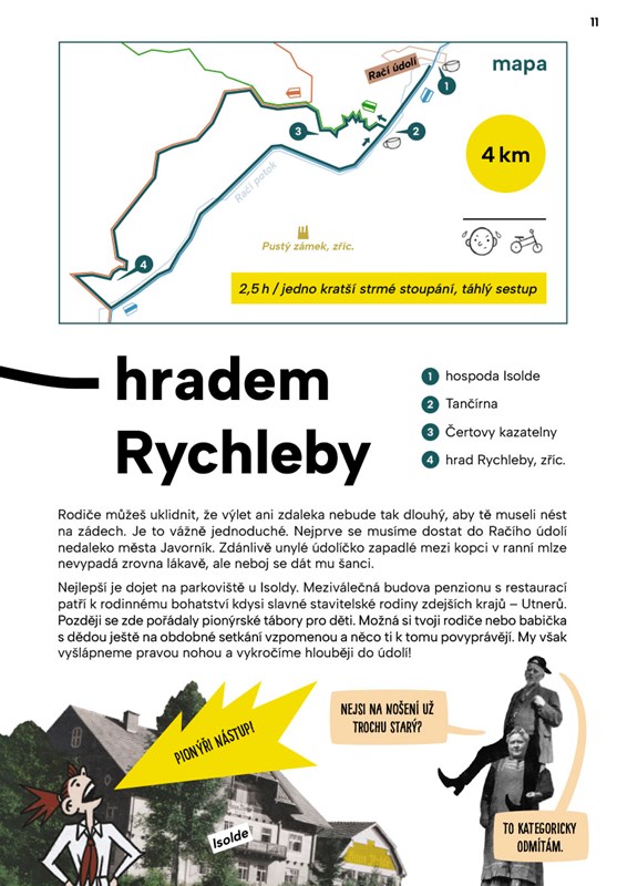 Ilustrovaný průvodce po Jeseníkách a Rychlebských horách je perfektní především pro děti. Na své výpravy však samozřejmě mohou přizvat i rodiče! Čekají vás pěší, cyklistické i běžkařské trasy s kratší vzdáleností, které zaručeně zvládnou i méně zkušení výletníci. Bezmála dvě desítky výletů doplňují veselé obrázky dokreslující atmosféru daných míst. A pokud lačníte po příbězích či výzvách, vrhněte se na doprovodné pověsti a užijte si nápadité aktivity. Tak hurá na cestu – dobrodružství už čeká!