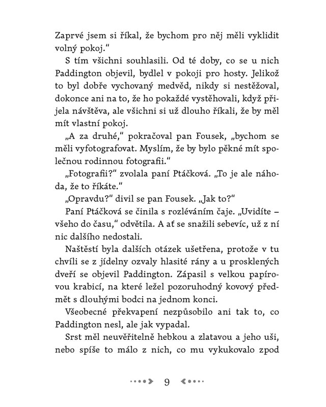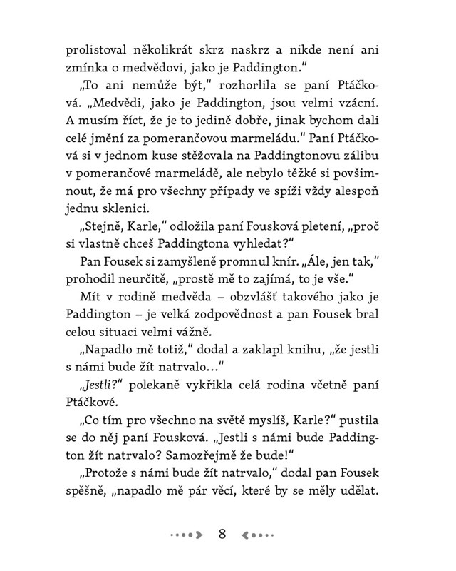 Paddington, medvídek z nejtemnějšího Peru, se spokojeně zabydluje u rodiny Fouskových v Londýně. Svými ztřeštěnými nápady mnohdy převrátí celý dům vzhůru nohama a Fouskovi se nestačí divit. Medvídek se totiž mimo jiné pustí do fotografování, vymaluje si pokoj, uspořádá ohňostroj, vyšetří detektivní případ, a jak se dá očekávat, úplně poklidně neproběhnou ani Paddingtonovy první Vánoce.