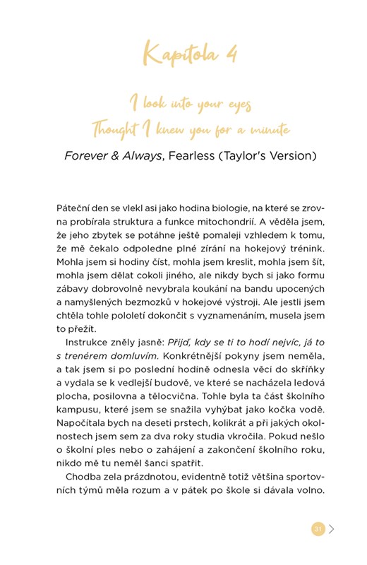 Maddie a Lucas bývali nejlepší kamarádi, dokud se Lucas nepřidal ke školnímu hokejovému týmu… a Maddie mu začala být na obtíž. Pro kapitána týmu je holka, co si po večerech ráda šije, hluboko pod jeho úroveň. Jejich cesty se znovu zkříží kvůli školnímu projektu, na kterém jsou nuceni spolupracovat. Dokážou spolu zase vycházet? A nevyplavou na povrch i dosud zapírané pocity? (napsala Monika Seidlová)
