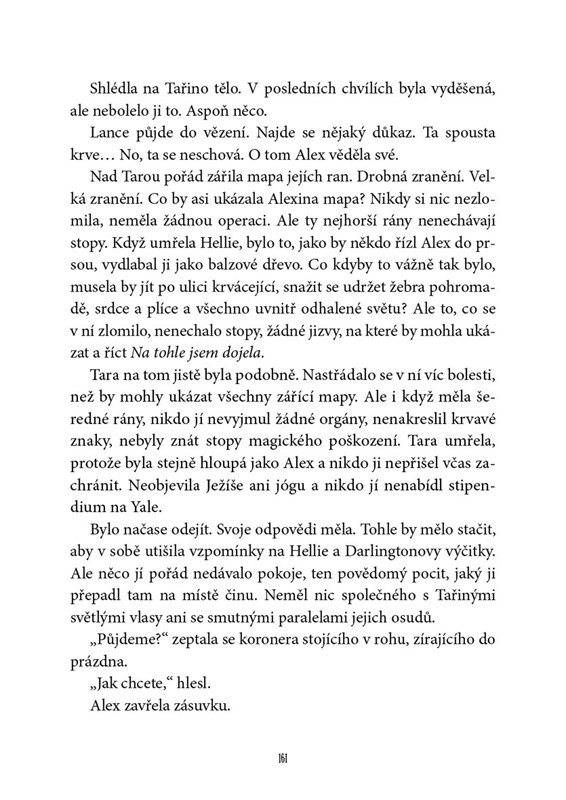 Když v kampusu najdou mrtvou dívku, ona je jediná, kdo nevěří líbivě učesanému vysvětlení, se kterým přišla policie. Alex totiž moc dobře ví, že tajné spolky jsou hrozivější a podivnější, než si kdo vůbec umí představit. Zahrávají si se zakázanou magií. Oživují mrtvé. A jejich kořistí se někdy stávají i živí…
