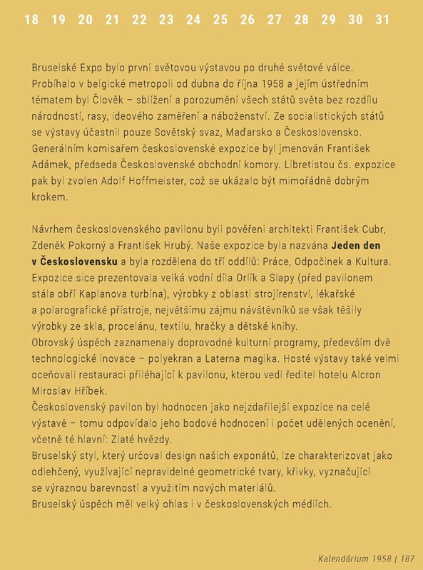 Jaký tedy byl rok, ve kterém Československo slavilo velký úspěch na výstavě Expo 58 v Bruselu? Svět se po válce vzpamatoval z nejhoršího a lidé začínají zase naplno žít. I v Československu doznívají nejhorší excesy ranných padesátých let. Domovní důvěrníci, fronty před obchody a budovatelská hesla kam se podíváš jsou sice stále běžnou realitou, ale kultura už se nadechuje k obrovskému rozmachu, který se naplno rozvine v následujících několika letech.