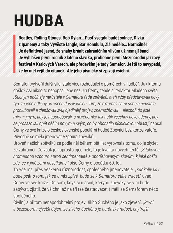 Rok 1962 už nikoho nenechává na pochybách, že kolo dějin se otáčí. Destalinizace jede na plné obrátky – z Letné mizí generalissimův pomník a Stalinova třída se stává Vinohradskou ulicí. Jako houby po dešti se po celé zemi objevují divadla malých forem a týdeník Mladý svět vypisuje první ročník ankety Zlatý slavík.