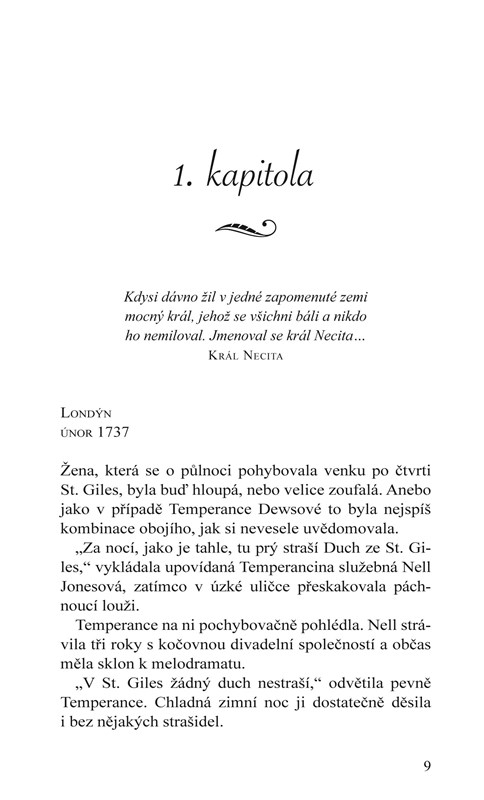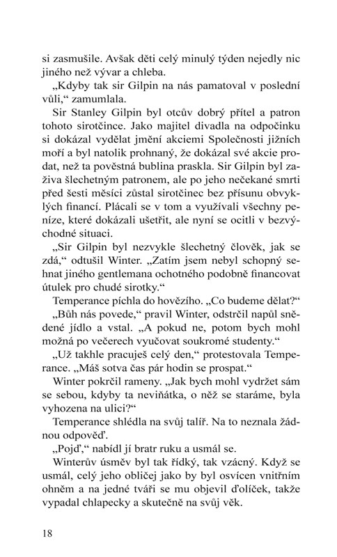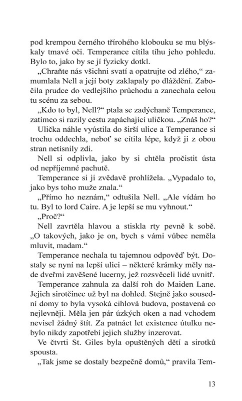 Dva naprosto odlišní jedinci zjišťují, že toho mají společného víc, než by se na první pohled zdálo. Ctnostná Temperance v sobě skrývá dlouho potlačované touhy a cynický a sobecký lord Caire v sobě naopak dokáže najít city, o nichž si vždy myslel, že jich není schopen. Bude jim to stačit k tomu, aby našli cestu k sobě, zachránili sirotčinec a odhalili bezcitného vraha, který děsí i jinak otrlé lidi z této chudinské čtvrti?