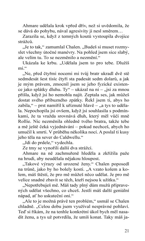Poté, co Ahmare unesou bratra, neexistuje nic, co by neudělala, aby ho získala zpět živého a zdravého. Není však připravena na to, kam až bude muset zajít kvůli jeho záchraně. Spolu s nebezpečným, ale podmanivým vězněm se vydá na výpravu do jiného světa. Duran, zrazený otcem, desítky let vězněný v podzemním žaláři, zůstal naživu jen proto, že prahne po pomstě. Čeká na možnost útěku a zažije šok nepravděpodobné a dočasné svobody v podobě odhodlané mladé upírky.