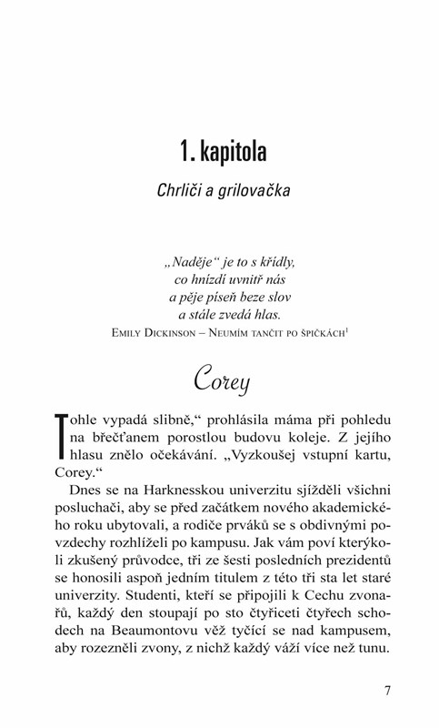 Bude však Adam ochotný rozejít se s dokonalou přítelkyní, aby mohl milovat někoho tak rozbitého jako Corey? Pokud ne, Corey ví, že si bude muset vybudovat na Harknesské univerzitě jiný život, který se nebude točit kolem sportu, ani kolem hnědookého kluka, jenž se možná příliš bojí ji milovat.