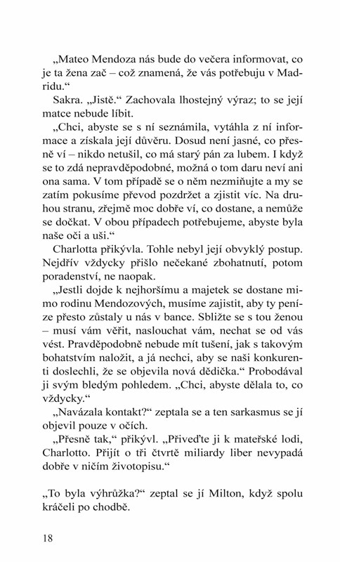 Jeden z nejbohatších španělských mužů umírá. Během přípravy pozůstalosti ho však postihne mozková mrtvice a jeho rodina s ohromením zjistí, že chce celý svůj majetek darovat mladé ženě, o níž nikdy neslyšeli. Co je zač a co je spojuje? Jeho nepochopitelné jednání jim pomáhá objasnit Charlotta Fairfaxová, londýnská poradkyně ohledně syndromu náhlého zbohatnutí, která to považuje za jednoduchý případ. Existuje přece pouze jediný důvod, proč starý muž odkáže krásné ženě peníze, nebo ne? V Madridu však začíná vyplouvat na povrch šokující minulost prominentní rodiny…