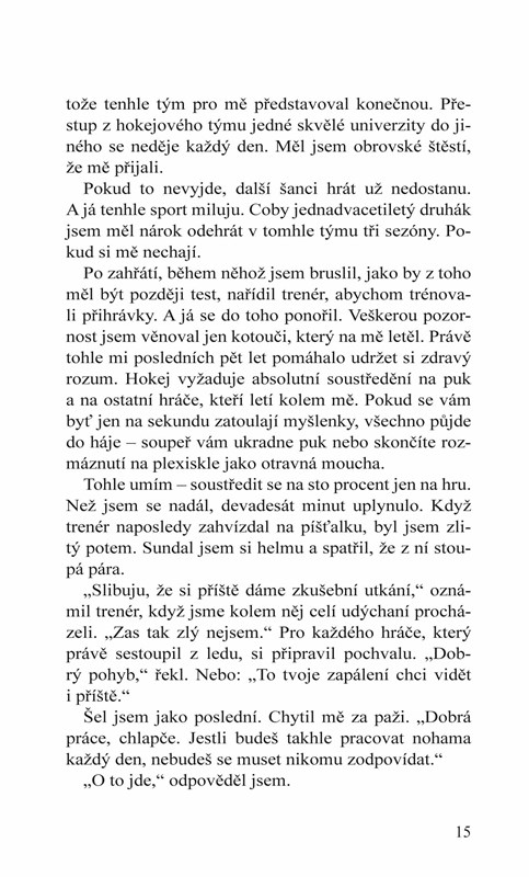 Nemůže uvěřit vlastním očím, když do šatny hokejového týmu Harknesské univerzity vstoupí duch jeho minulosti, s taškou s hokejovou výstrojí na rameni a s tím samým úsměvem, kterému Graham kdysi nedokázal odolat. V tu chvíli je jedinou reakcí, na kterou se Graham zmůže, čirá panika. Jediné omylem pronesené slovo a nový člen týmu by mohl Grahamovi zničit celý život.
