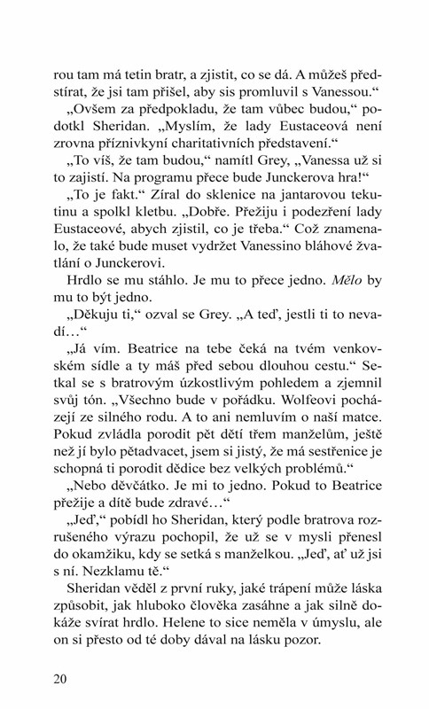Sheridan má pro Vanessu slabost, ale nechce se ženit, protože v srdci stále ještě vzpomíná na svou zesnulou snoubenku. jelikož má vyzpovídat lady Eustaceovou, jde na to přes dvoření se Vanesse. O té se sice ve společnosti tvrdí, že je zamilovaná do autora divadelních her Junckera, ale nic není takové, jaké se zdá.