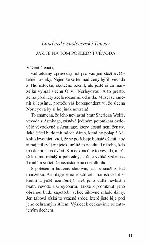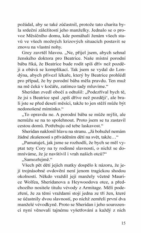 Sheridan Wolfe, starší syn z třetího manželství vévodkyně z Armitage, se po nenadálé otcově smrti stává nečekaně vévodou z Armitage, přestože se po celý život připravoval na dráhu diplomata. A nejen že se hned po počátku své vévdoské éry potýká s finančními problémy, ještě ke všemu inicioval rodinné vyšetřování podezřelého úmrtí všech tří manželů ovdovělé vévodkyně.