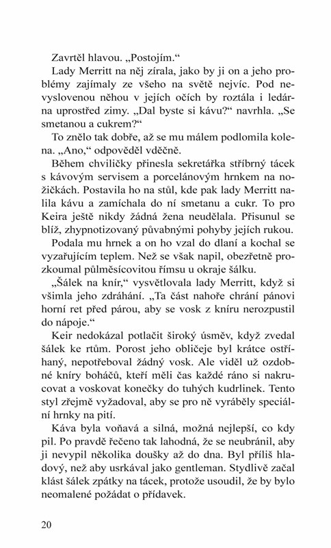 Lady Merritt Sterlingová, tvrdohlavá kráska, která řídí dopravní společnost, dobře ví, že londýnská společnost umírá touhou přistihnout ji při skandálu. Zatím byla příliš chytrá, než aby jí vyhověla. Jenže pak pozná Keira MacRae, drsného a ošlehaného skotského výrobce whisky, a všechny její praktické plány se rozplynou jako dým. Nemohli by být odlišnější, než jsou, ale vznikne mezi nimi mocná, syrová a nepřekonatelná přitažlivost. Od chvíle, kdy Keir MacRae přijede do Londýna, má jen dva cíle. Za prvé: nezamilovat se do oslnivé lady Merritt Sterlingové. Za druhé: nenechat se zabít. Zatím se mu ani jedno z toho moc nedaří. Keir neví, proč ho chce někdo usmrtit, dokud osud neodhalí tajemství jeho záhadné minulosti. Jeho svět se otočí vzhůru nohama a jediný, komu věří, je Merritt.