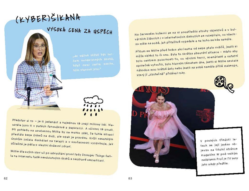 Nečekejte ale jenom seznam jejích úspěchů. Dozvíte se i o lekcích a překážkách, které jí osud přichystal. Přestože se Millie odmala potýkala s problémy, jako je částečná hluchota, nikdy se nenechala ničím zastavit. Díky svému odhodlání neustále všem ukazuje, jak s odvahou přijímat vlastní odlišnost. Otevřeně mluví o temných stránkách sociálních sítí a jejich dopadu na lidskou psychiku – sama totiž zažila drsnou šikanu. A svůj vliv a slávu neustále využívá ve prospěch slabších.