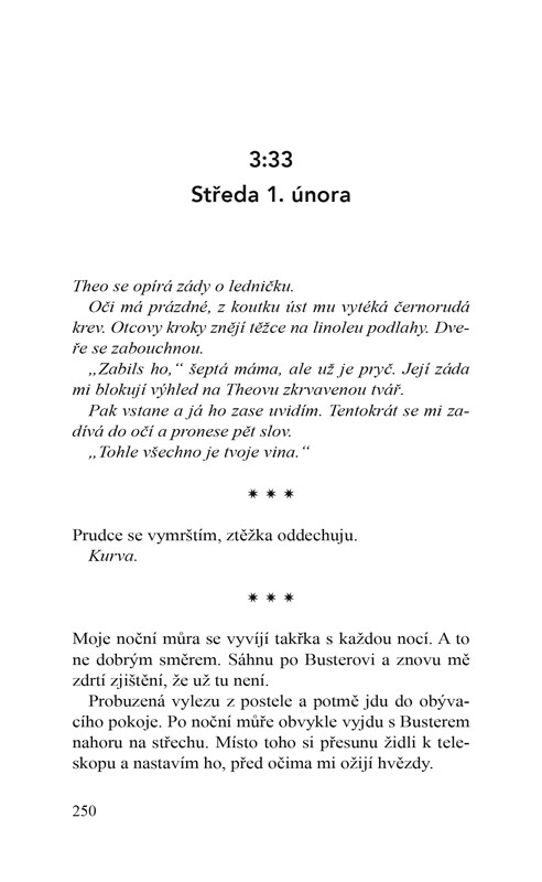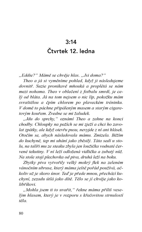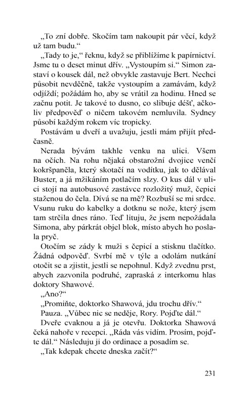 Na Silvestra dojde k zavraždění jednoho z bezdomovců a do malého, uzavřeného světa Rory vtrhne ten vnější – policie, noví sousedé, vlastní temná minulost a nové možnosti. Někdo ji sleduje, to už je jisté; obavy, s nimiž žije už řadu let, narůstají. Má utéct ze své svatyně, která jí začíná připadat spíš jako vězení, anebo zůstat v bezpečí za zamčenými dveřmi – možná až do smrti?