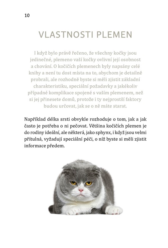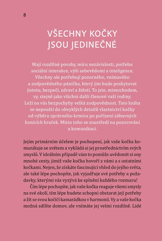 Kočky vyvíjejí ohromné úsilí k tomu, aby s námi komunikovaly. Jsou to vysoce inteligentní nezávislé bytosti, které umí komunikovat s námi lidmi, stejně jako mezi sebou. Tato kniha vám ukáže, jak dobře naslouchat a pozorně kočku pozorovat. Podpoří vás v tom, abyste byli pohotoví a pozorní k oněm mnoha způsobům, jimiž s vámi vaše kočka neustále hovoří. Jakmile přestanete vnímat sebe jako středobod všeho a ztišíte se – fyzicky a především slovně – budete moci lépe posoudit, co se vám pokouší říct. To povede z vaší strany k lepšímu naplňování jejích potřeb, prohloubení pouta důvěry mezi vámi a vytvoření šťastné domácnosti.